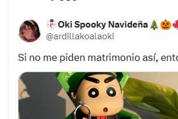 "Si no me piden matrimonio así, entonces no quiero nada 💍✨", ha escrito junto a varias imágenes de la figura. la tuitera, que se autodefine en su descripción como "otak o gamer" y asegura que "Shin Chan es la mejor serie".