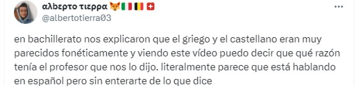 Con esta observación, el tuitero le ha dado la razón a su profesor de griego de bachillerato, quien les explicaba a sus alumnos que esta lengua y el castellano eran muy parecidas fonéticamente.