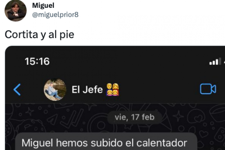 "Miguel hemos subido el calentador. Miguel vamos a subir el calentador", comienza diciéndole su padre. Él, sorprendido ante estos dos mensajes, le pregunta si "hemos o vamos". La respuesta de su padre ya es historia de Twitter: "Vas".