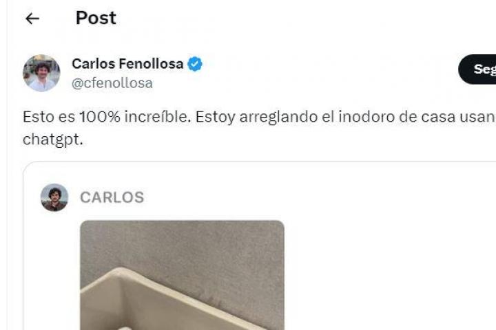 Un profesor de la Universidad Internacional de Cataluña (UIC) de Barcelona, Carlos Fenollosa, ha publicado en su cuenta de X, antes Twitter, cómo ha conseguido arreglar el inodoro de su casa gracias a las instrucciones de ChatGPT.