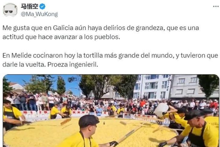 "Me gusta que en Galicia aún haya delirios de grandeza, que es una actitud que hace avanzar a los pueblos. En Melide cocinaron hoy la tortilla más grande del mundo, y tuvieron que darle la vuelta. Proeza ingenieril", ha manifestado el usuario.