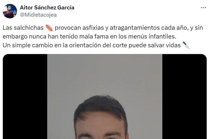 El nutricionista y tecnólogo alimentario Aitor Sánchez (@Midietacojea) ha subido un vídeo a su cuenta de la red social X, anteriormente conocida como Twitter, en el que cuenta cómo se deben cortar las salchichas para evitar atragantamientos en los niños.