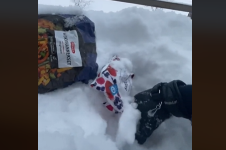 Ha empezado a sacar todo lo "almacenado" fuera: nuggets de pollo congelados, un wok, frutos rojos y helados. "Se que aquí tenemos helado, pero no logro encontrarlo", ha afirmado mientras seguía metiendo la mano, tapada por el guante, en la nieve.