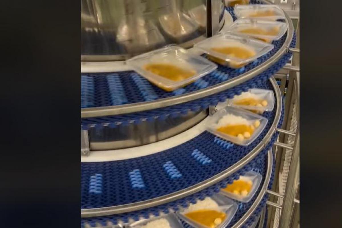 Por otro lado, mediante una máquina que llaman "multicabezal", dosifican los dados de pollo marinados y precocinados previamente. Utilizan otra máquina para hacer la salsa de curry, donde sofríen la cebolla, trituran y le dan "el punto" que quieren a la salsa.