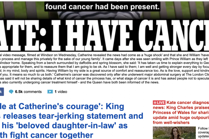 Los tabloides británicos también coinciden en el uso de la palabra "shock". El Daily Mail ha explicado en su noticia principal que Guillermo se enteró de que Kate Middleton tenía cáncer el pasado 27 de febrero y hablan del "valiente" anuncio en un "emotivo" mensaje. Además, llevan noticias del estilo: Cómo decirles a tus hijos que tienes cáncer. Con una foto de Middleton junto a sus hijos.