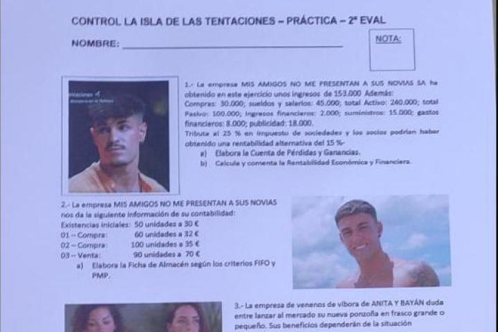 "Y claro, al final son cuatro ejercicios normales de Economía, cuatro de los que entran en Selectividad, pero con las fotos de La Isla de las Tentaciones y con el chiste y la broma del nombre de la empresa. Pero Los contenidos son los mismos, el examen lo puede hacer alguien que nunca haya visto La Isla ni sepa de qué va", matiza el docente.