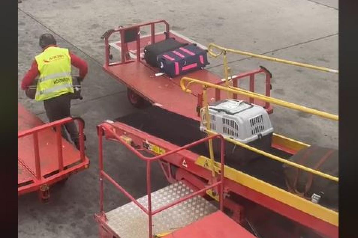 Uno de los trabajadores, encargado de recoger las maletas de la bodega y pasarlas al aeropuerto para ser posteriormente recogidas por sus dueños, ha abierto los brazos en forma de abrazo cuando ha visto que uno de los bultos era un perro.