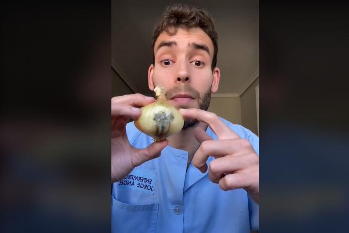 "Cuidado con esto, amigos y amigas. Esta mañana estaba cocinando unos ricos macarrones y he visto que la cebolla tiene moho", empieza explicando.
