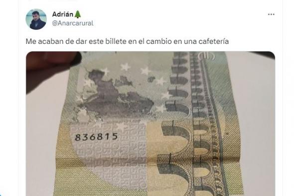 De este último caso ha dado ejemplo el usuario de Twitter @Anarcarural, que ha subido a la red social con gran éxito la foto de un billete de cinco euros que le dieron como cambio en una cafetería.