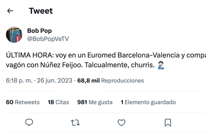 Bob Pop ha compartido en un hilo de Twitter cómo ha sido su viaje en tren con Alberto Núñez Feijóo, con el que ha coincidido en un vagón del Euromed entre Barcelona y Valencia, ciudad a la que el escritor iba a dar una charla en unas jornadas.