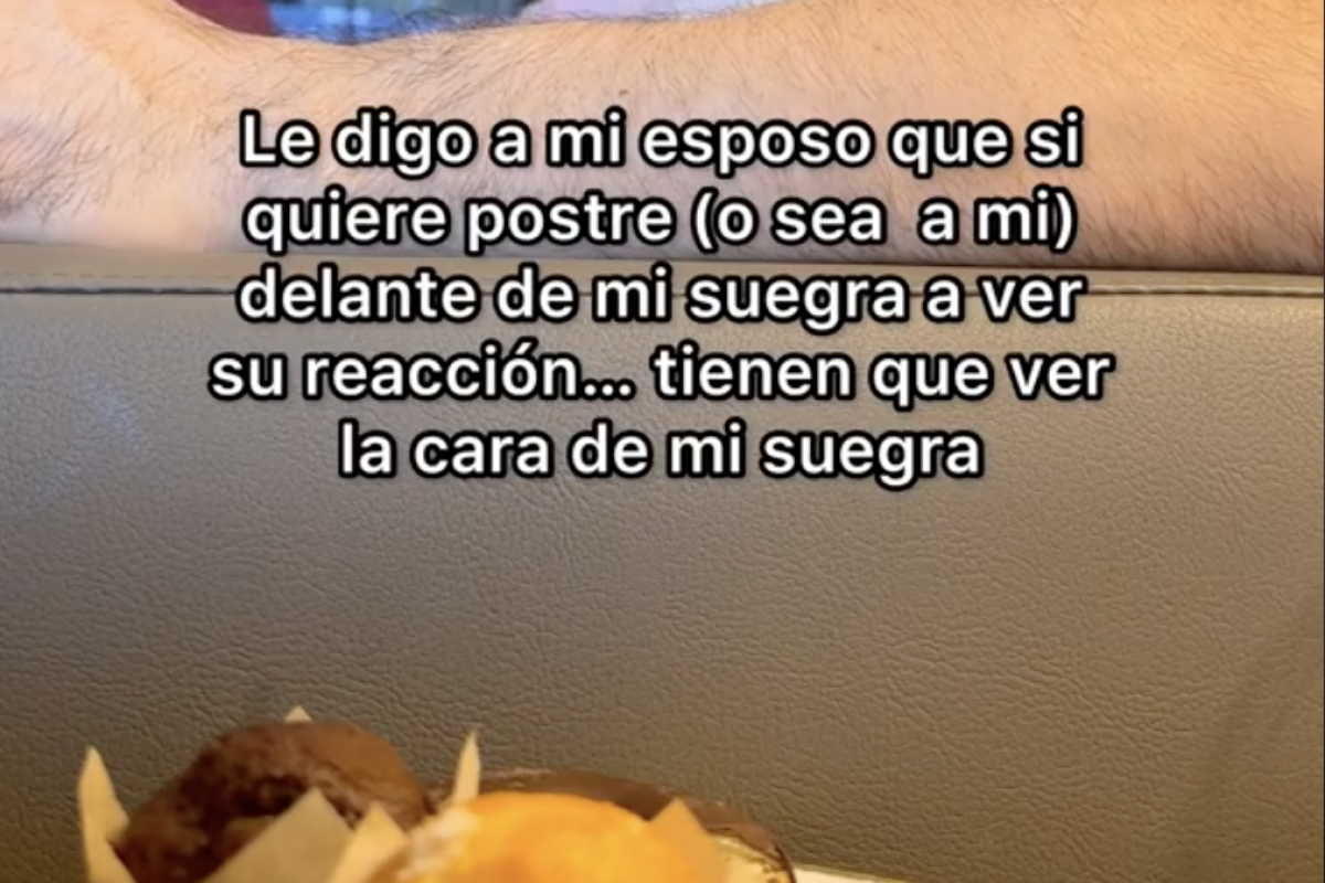 "Quieres postre", le dice a su pareja mientras ésta come un donut. "Ya estoy comiendo, amor", le responde. "No, de otro postre. Yo", le dice de nuevo en tono de humor para que su suegra lo escuchase.