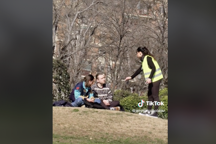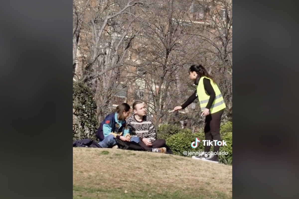 A las dos primeras personas a las que se acerca en la grabación les pregunta si están haciendo un pícnic romántico y les termina diciendo esto: "En este mes de febrero, hasta nueva orden, no se puede hacer (...) Es una multa de 300 euros, y no quiero risas porque esto es muy serio".