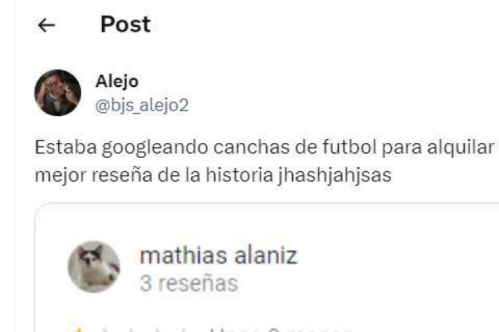 El usuario de X @bjs_alejo2 ha publicado la fotografía de una reseña de Google que se ha encontrado mientras buscaba alquilar un campo de fútbol.