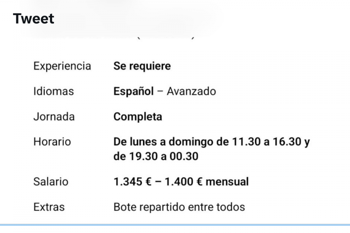 Hasta aquí todo normal, lo impactante viene ahora, cuando dice "medio día de fiesta (miércoles)". En el resto de la oferta pide "español avanzado", jornada completa con un horario de lunes a domingo de 11:30 a 16:30 y de 19:30 a 00:30 con un sueldo de 1400 euros con las propinas a repartir.