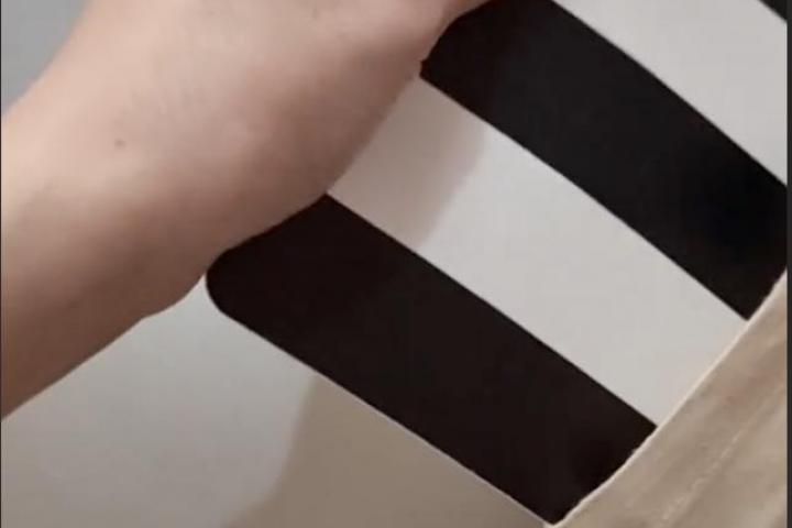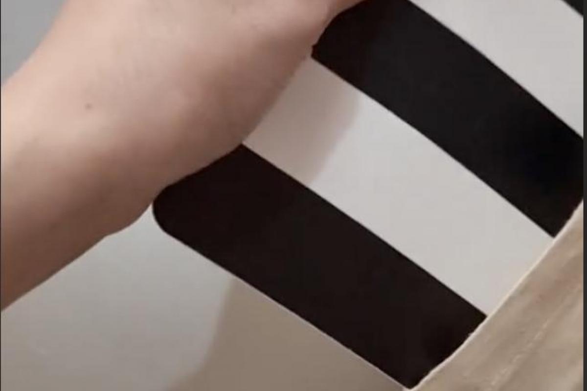 Lo primero que saca es un tapete de rayas blancas y negras, colores corporativos de la empresa, después una taza sin lacar, que como esta persona ha dicho "da bastante dentera" y por último una tote bag de Barcelona. Una tote bag un poco extraña porque su tienda no está en Cataluña.