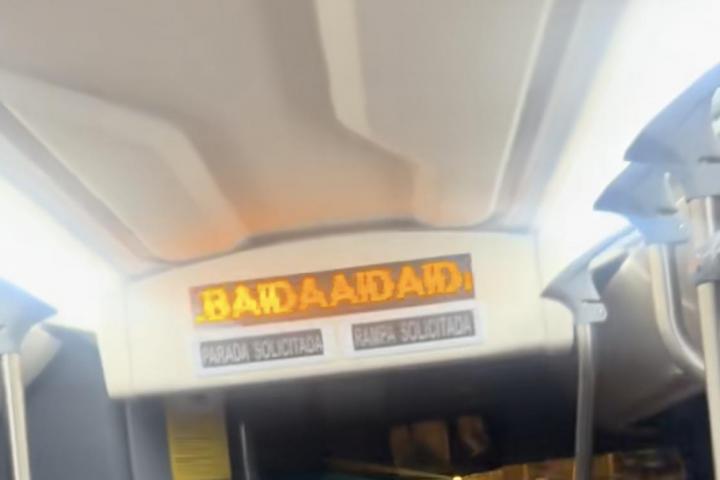Por algún tipo de error, el cartel que debe anunciar las paradas ha empezado a poner cosas raras como "róxima, próxima paradadaradaradirgen" o "vírgen de la fla fla la santa instanta".