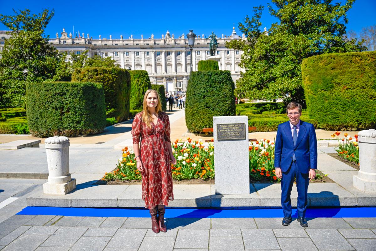 Además, la princesa también descubrió una placa que se ha instalado junto a ese jardín de tulipanes en el que se ha inscrito el mensaje de agradecimiento que ha querido plasmar: "Muchas gracias por mi tiempo en Madrid. ¡Disfruten de los tulipanes!".