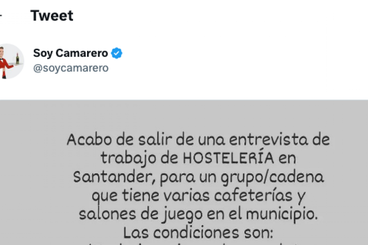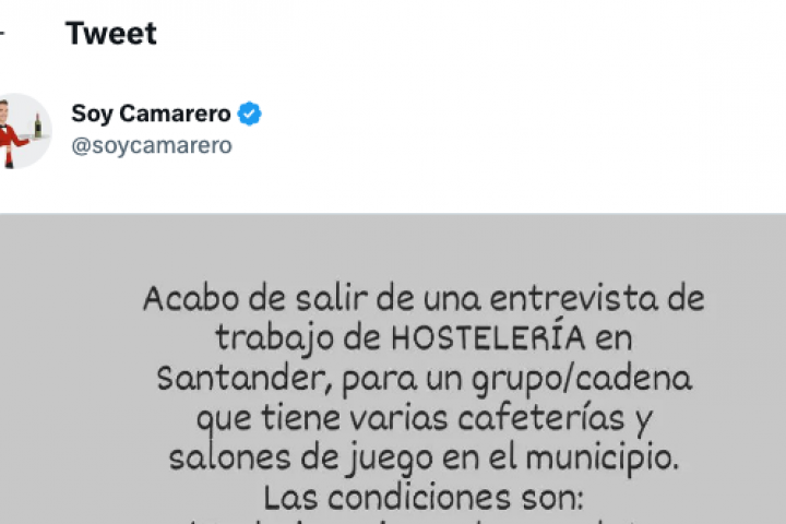 En las últimas semanas están proliferando en redes sociales multitud de quejas por las condiciones laborales que algunos hosteleros ofrecen en sus negocios. La cuenta Soy Camarero, dedicada a publicar contenido relacionado con la hostelería, ha compartido en su perfil de Twitter la experiencia de un trabajador que ha salido de una entrevista.