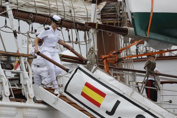 En el momento en que bajaba del emblemático bergantín-goleta, la princesa Leonor sufrió un pequeño resbalón debido a la lluvia y la niebla en el puerto.