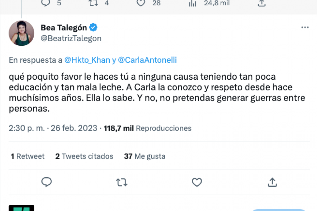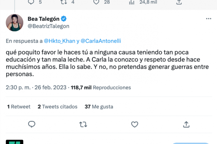 Y a raíz de todo ello, un usuario ha citado a Antonelli para decirle: "Oye, que está señorita dice que eres una infeliz por ser mujer...". La propia Talegón ha respondido intentando zanjar la polémica: "Qué poquito favor le haces tú a ninguna causa teniendo tan poca educación y tan mala leche".