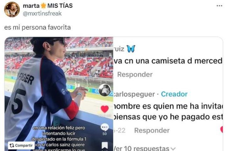 La tuitera Marta (@mxrtinsfreak) ha publicado un tuit en la red social X en el que ha puesto una captura de pantalla de un video de TikTok de Carlos Peguer viendo la Fórmula 1 junto con otra de un sincero comentario del influencer en el mismo vídeo.