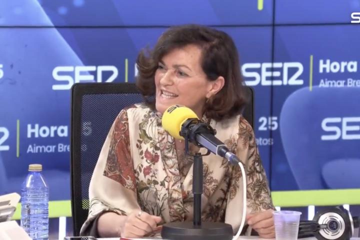 "¿Qué pasa? ¿Disfrutáis menos?", le preguntaba Carmen Calvo después de escuchar la explicación de Aimar Bretos sobre el estudio que ha revelado cómo reacciona el cerebro de las personas obesas y que puede mejorar el tratamiento de esta enfermedad crónica. "¡Cómo que disfrutáis! Carmen, ¿me has llamado gordo? Me voy ahora mismo", respondía el conductor de Hora 25 en un momento que se puede ver en las redes sociales del espacio.