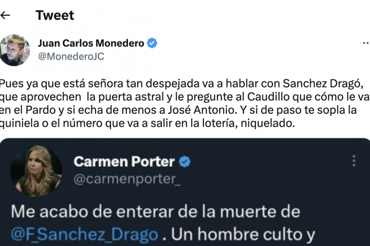 Juan Carlos Monedero ha compartido en su perfil oficial de Twitter, con más de 640.000 seguidores, una captura de pantalla con un tuit falso donde Carmen Porter habla sobre la muerte de Fernando Sánchez Dragó, fallecido este lunes a los 86 de un infarto.