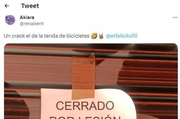 "Cerrado por lesión" se lee en grandes letras mayúsculas. Y, justo debajo, añade: "Siento las molestias ¡¡¡pero yo tengo más!!!. Consultas por WhatsApp". "Un crack el de la tenda de bicicletes 🤣🤘🏾", ha escrito el usuario junto a la imagen.
