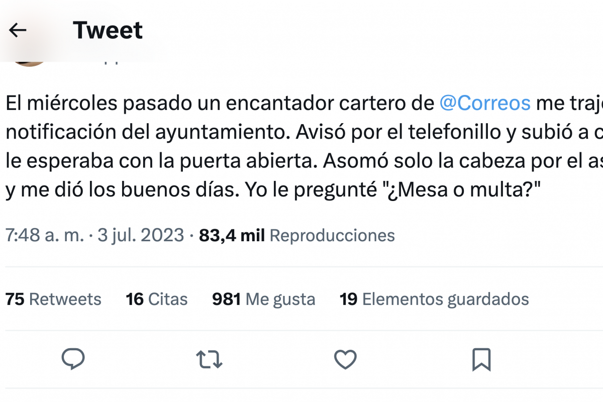 "El miércoles pasado un encantador cartero de Correos me trajo una notificación del ayuntamiento. Avisó por el telefonillo y subió a casa. Yo le esperaba con la puerta abierta. Asomó solo la cabeza por el ascensor y me dio los buenos días. Yo le pregunté '¿Mesa o multa?'", ha empezado contando.