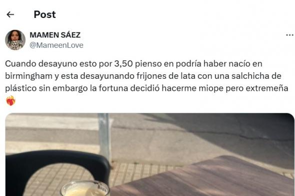 Lo ha subido a X la usuaria @MameenLove junto al mensaje: "Cuando desayuno esto por 3,50 pienso en que podría haber nacío en Birmingham y estar desayunando frijones de lata con una salchicha de plástico. Sin embargo la fortuna decidió hacerme miope pero extremeña".