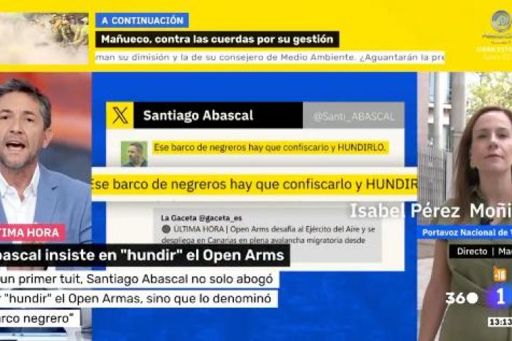 Tenso momento el que se ha vivido entre Javier Ruiz y la diputada nacional de Vox, Isabel Pérez Moñino, en pleno directo en Mañaneros a cuenta de las últimas palabras de Santiago Abascal sobre "hundir" el Open Arms.
