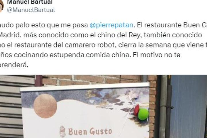 El popular restaurante chino de Madrid Buen Gusto, conocido entre otros nombres como 'El chino del Rey', cerrará el próximo 30 de junio después de que hayan comprado el local en el que se encontraba desde hace 27 años.
