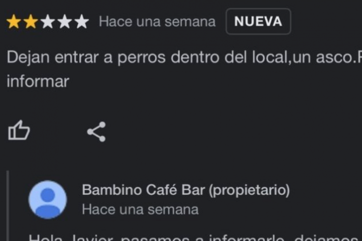 La reseña del cliente, encabezada con dos estrellas sobre cinco, era contundente: "Dejan entrar perros dentro del local. Un asco. Podían informar".