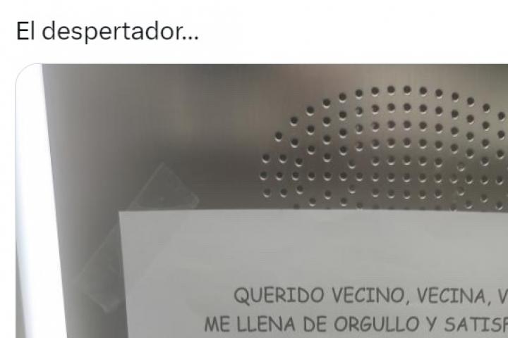 En el escrito colocado en el ascensor, ha ironizado con que igual "te crees que te lo van a pedir para dar las campanadas en Nochevieja, pero ya te aseguro que eso no será así". "Te ruego bajes unos cuantos puntos el volumen de tu magnífico despertador, ya sabemos que funciona muy bien", ha resaltado.