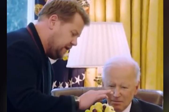 Biden, sentado en la mesa de su despacho y atónito por lo que le iba a entregar Corden unos segundos después, termina acercando las manos para coger una especie de ramo formado por frutas que sirve "de snack y de regalo al mismo tiempo".