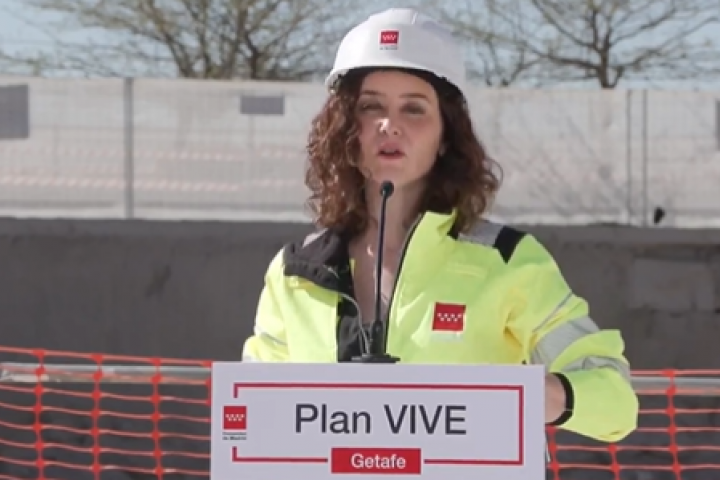 La presidenta de la Comunidad de Madrid, Isabel Díaz Ayuso (PP), ha estado este martes en las obras de construcción de viviendas del 'Plan Vive' en Getafe, donde ha aprovechado para cargar contra el Gobierno central por los "graves problemas que tenemos en las cercanías".