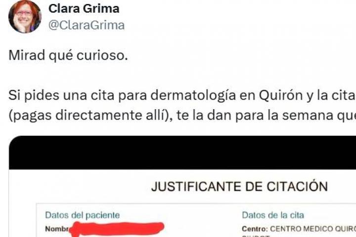 "Mirad qué curioso. Si pides una cita para dermatología en Quirón y la cita es PRIVADA (pagas directamente allí), te la dan para la semana que viene", ha escrito en la red social motrando la captura con la cita. En ella se puede ver que se la dan para el próximo 27 de agosto a las 11:10.