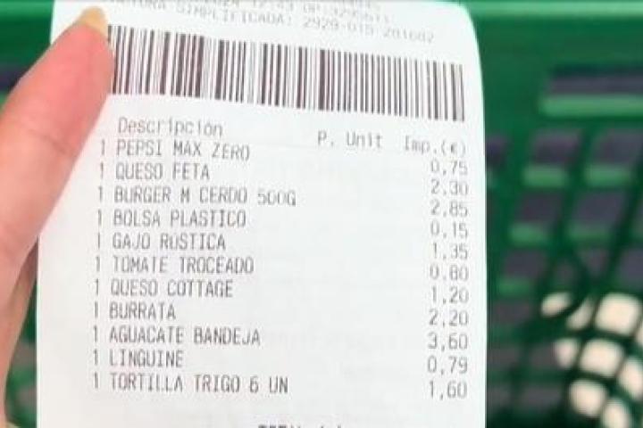 En Países Bajos ha comprado carne picada, queso fresco, una lata de refresco, tortillas, espaguetis, tomate troceado, salsa de ajo, aguacates y burrata. En total le ha costado 14,53 euros. En España ha hecho exactamente la misma compra, todo prácticamente más caro: ha terminado pagando casi 17,59.