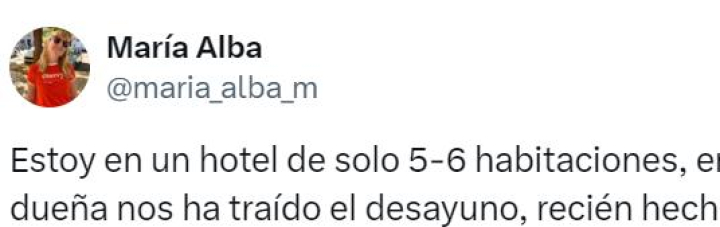 "Estoy en un hotel de solo 5-6 habitaciones en un pueblo de Sicilia. La dueña nos ha traído el desayuno, recién hecho, de un 'pastificcio' del pueblo de al lado", ha expresado al inicio del tuit, que cuenta con más de 41.000 'me gusta' en apenas unos días (y subiendo).