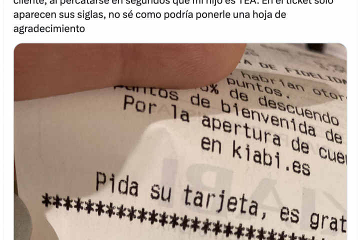 "No sé de qué manera agradecer, a la chica que me atendió ayer en @KiabiES de La Línea de la Concepción. Me dio preferencia como cliente, al percatarse en segundos que mi hijo es TEA. En el ticket solo aparecen sus siglas, no sé como podría ponerle una hoja de agradecimiento", ha escrito en la red social de Elon Musk.