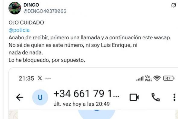 "OJO CUIDADO, Policía Nacional. Acabo de recibir, primero una llamada y a continuación este WhatsApp. No sé de quien es este número, ni soy Luis Enrique, ni nada de nada. Lo he bloqueado, por supuesto", ha escrito.