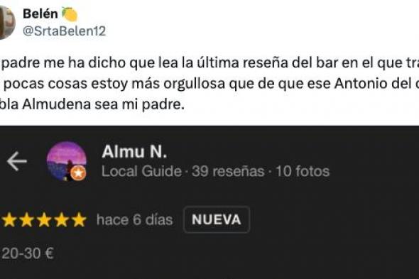 "Mi padre me ha dicho que lea la última reseña del bar en el que trabaja. De pocas cosas estoy más orgullosa que de que ese Antonio del que habla Almudena sea mi padre", ha afirmado la tuitera, que ha compartido un pantallazo de la valoración que le había dejado.
