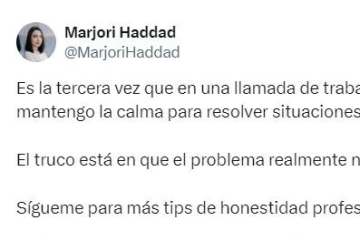 La tuitera Marjori Haddad (@MarjoriHaddad) ha explicado a través de la red social X cuál es su secreto para conseguir mantener la calma en el trabajo cuando debe resolver situaciones de mucho estrés.