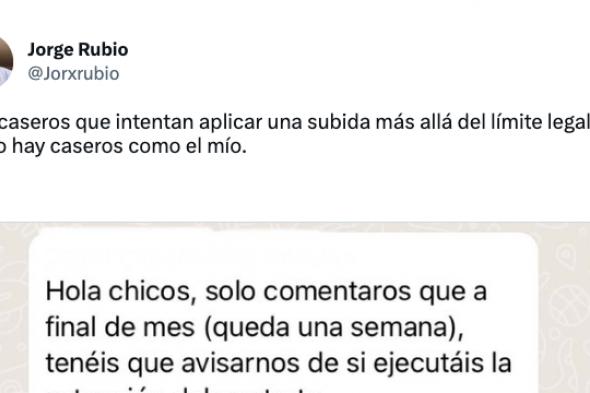 "Hay caseros que intentan aplicar una subida más allá del límite legal y luego hay caseros como el mío", ha escrito junto a un pantallazo en el que se ve el mensaje de WhatsApp que le ha mandado el propietario.