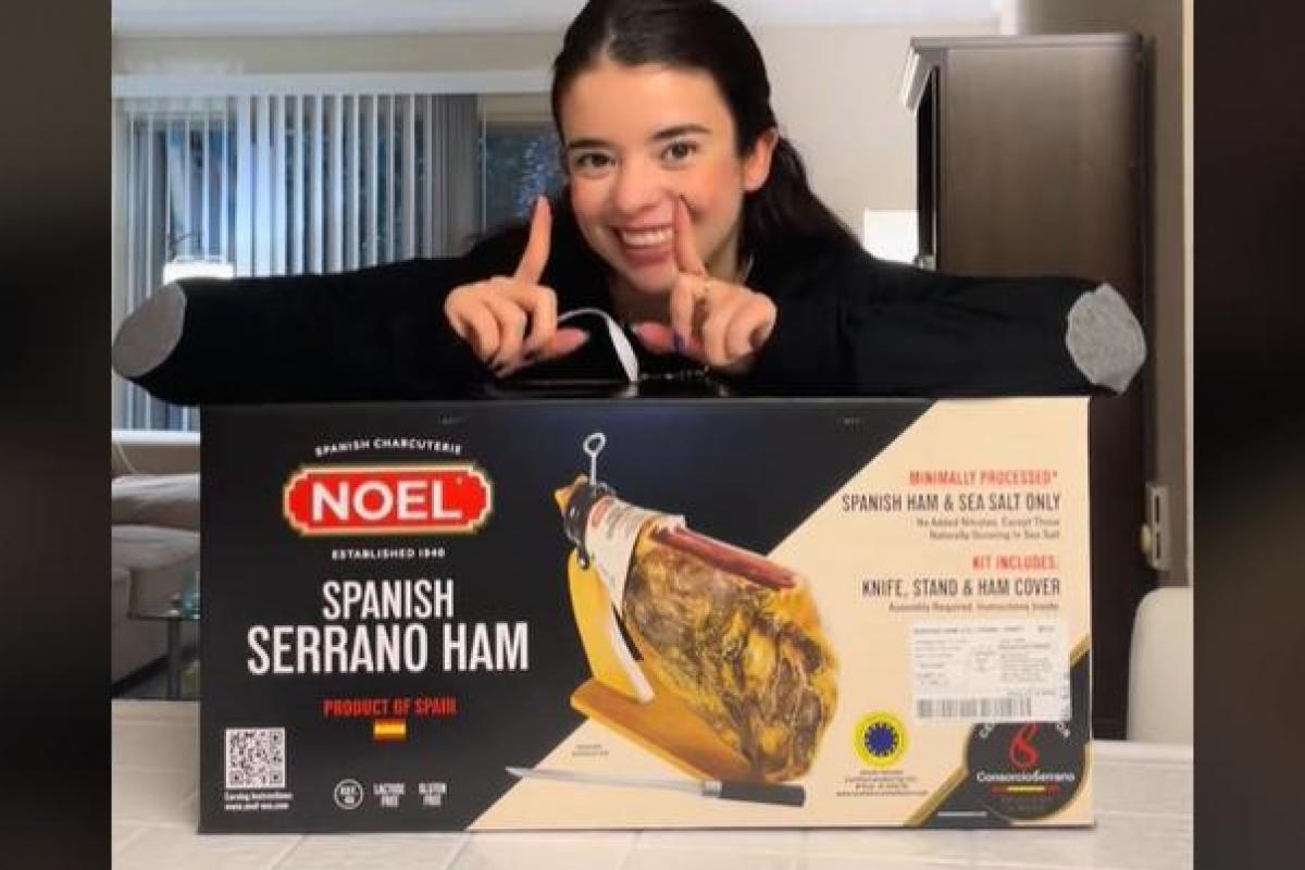 La usuaria española de TikTok, Sheila Hernández (@sheihernandezalcala), vive actualmente en California, Estados Unidos, y ha comprado por primera vez una pata de jamón serrano "español", tal y como ha indicado la caja.