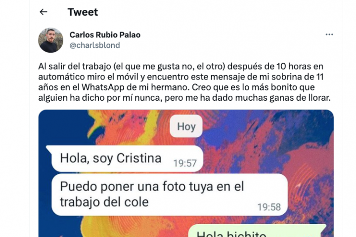 El escritor Carlos Rubio Palao ha emocionado a miles y miles de personas en Twitter al mostrar en esa red social el mensaje de WhatsApp que le había enviado su sobrina de 11 años.