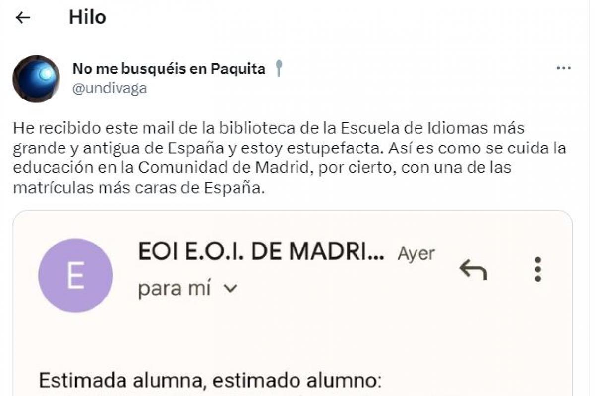 En un tuit posterior, la internauta ha pedido al diputado de Unidas Podemos Agustín Moreno la posibilidad de tratar el asunto en la Asamblea de Madrid debido a que "hay más escuelas de idiomas afectadas", ha asegurado.