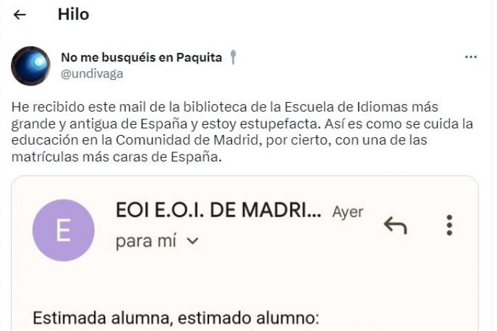 Según se puede leer en el mensaje, la ubicada en la Escuela Oficial de Idiomas Jesús Maestro "está cerrada" y no tienen servicio de préstamos porque se han quedado sin bibliotecaria. "Así es como se cuida la educación aquí, por cierto, con una de las matrículas más caras de España", ha dicho indignada la tuitera.