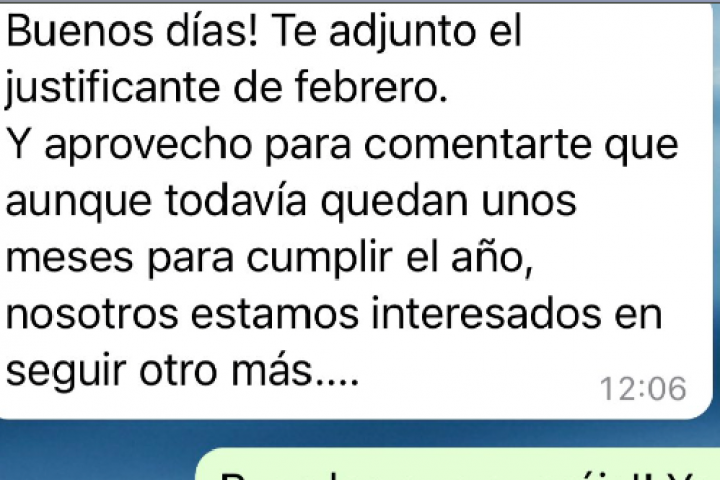 El diálogo lo inicia precisamente el arrendatario, que dice: "Buenos días. Te adjunto el justificante de febrero. Y aprovecho para comentarte que, aunque todavía quedan unos meses para cumplir el año, nosotros estamos interesados en seguir otro más...".