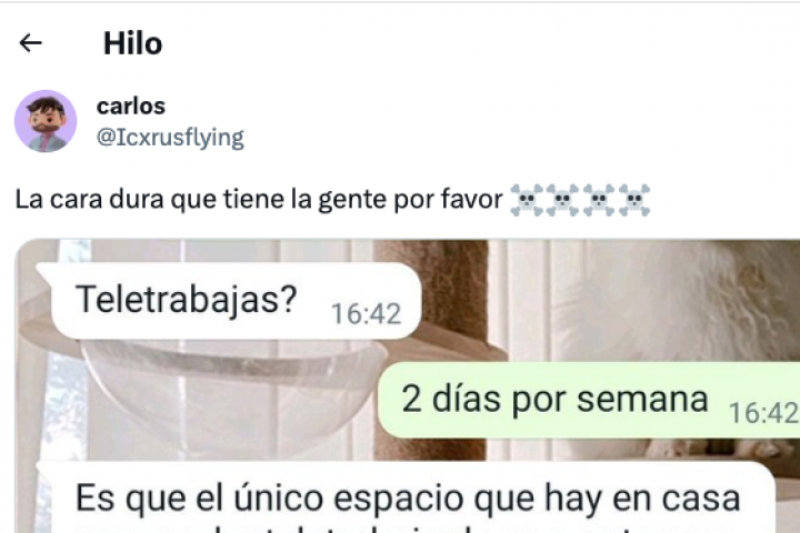 En el pantallazo se ve que el dueño le pregunta si teletrabaja y él responde que sí, que dos días por semana. Eso automáticamente le descarta: "Es que el único espacio que hay en casa para poder teletrabajar lo uso, entonces busco a alguien que no teletrabaje. Lo siento".